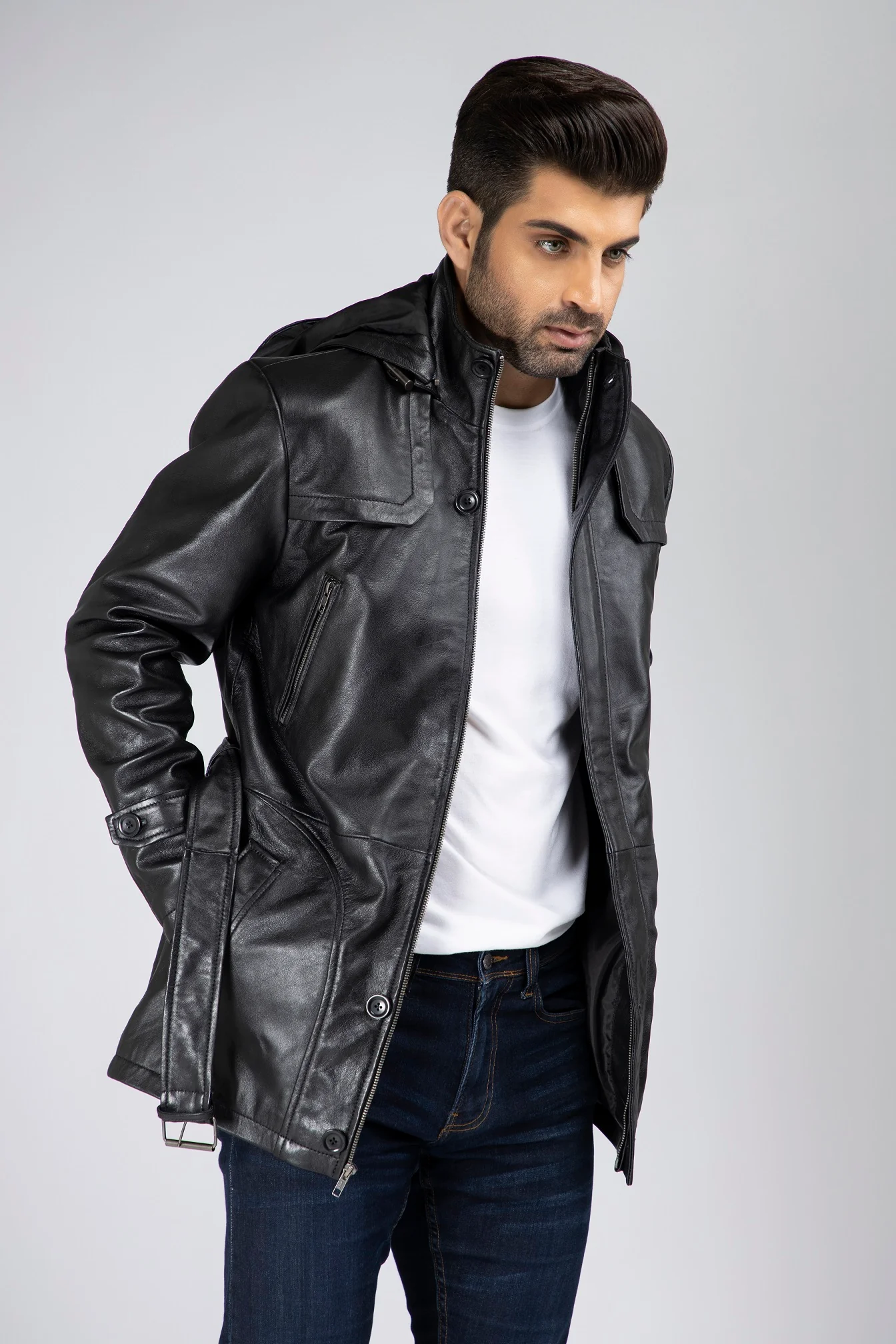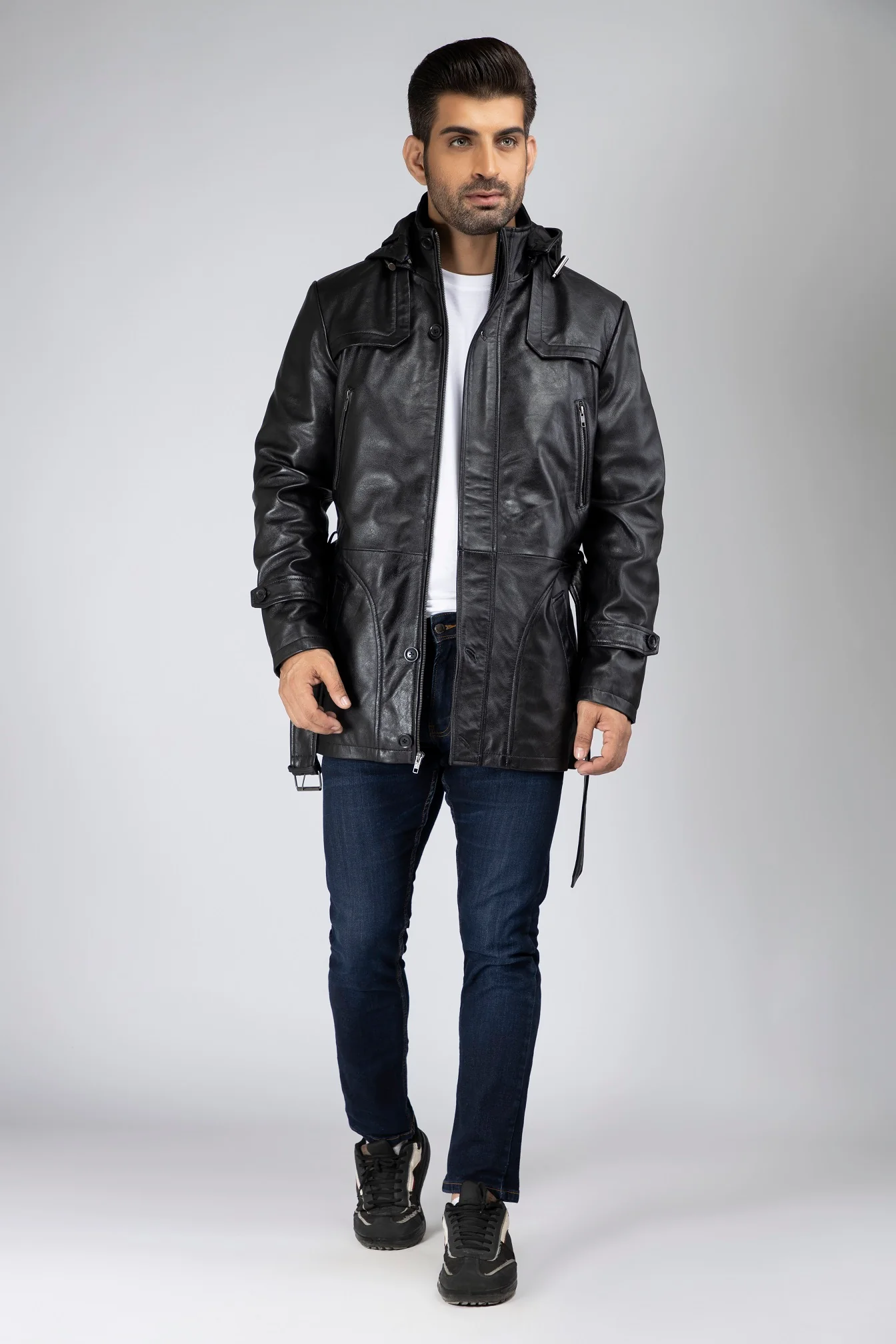 Mens Zak Front Button and Zippered Hooded Leather Coat