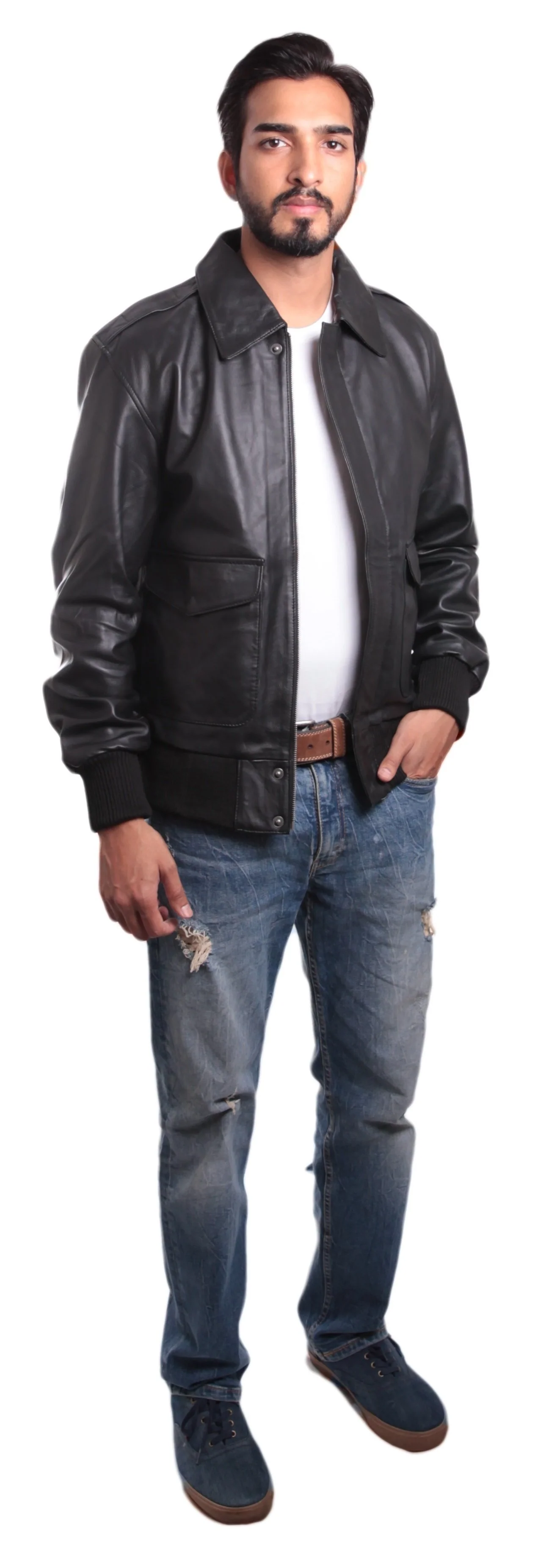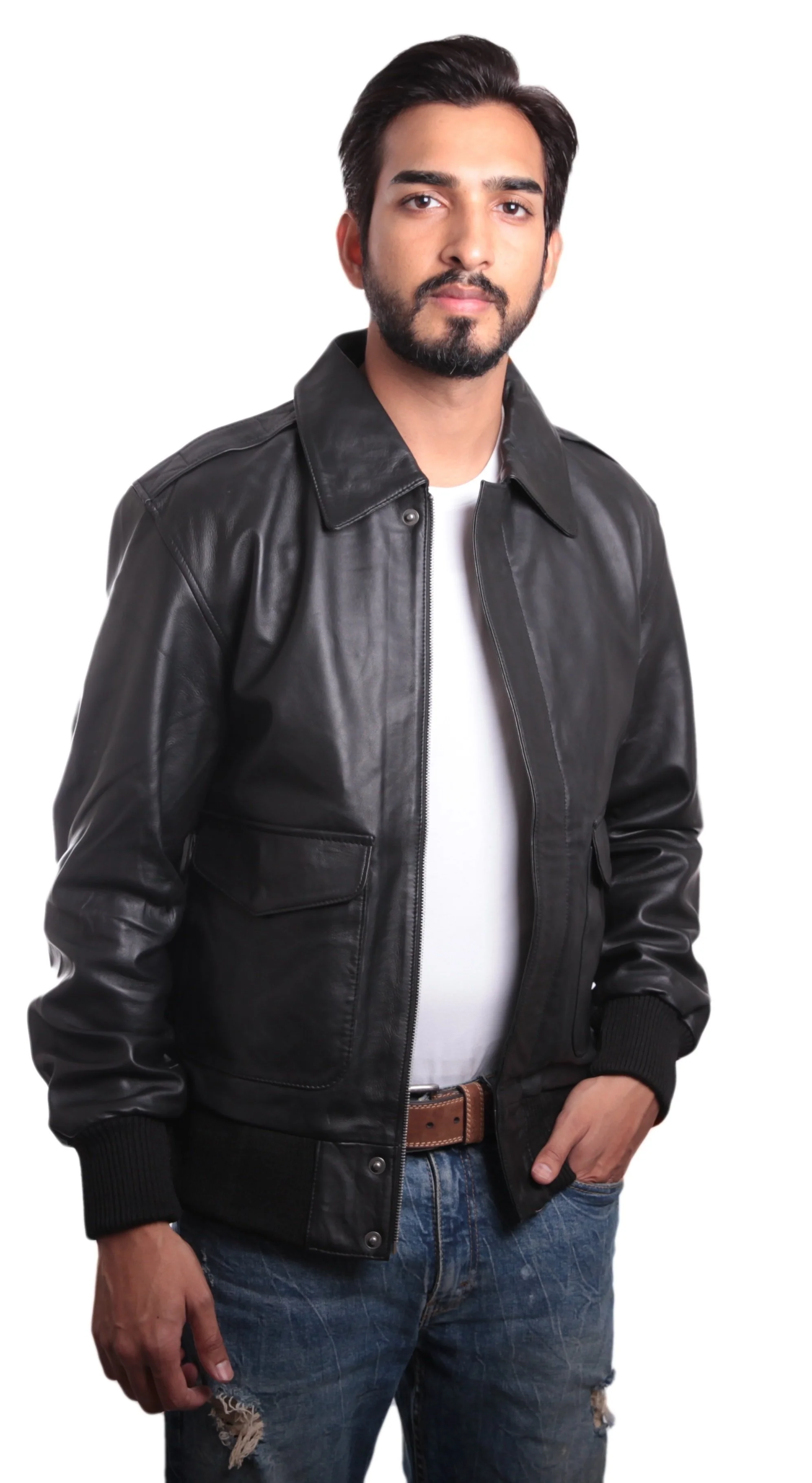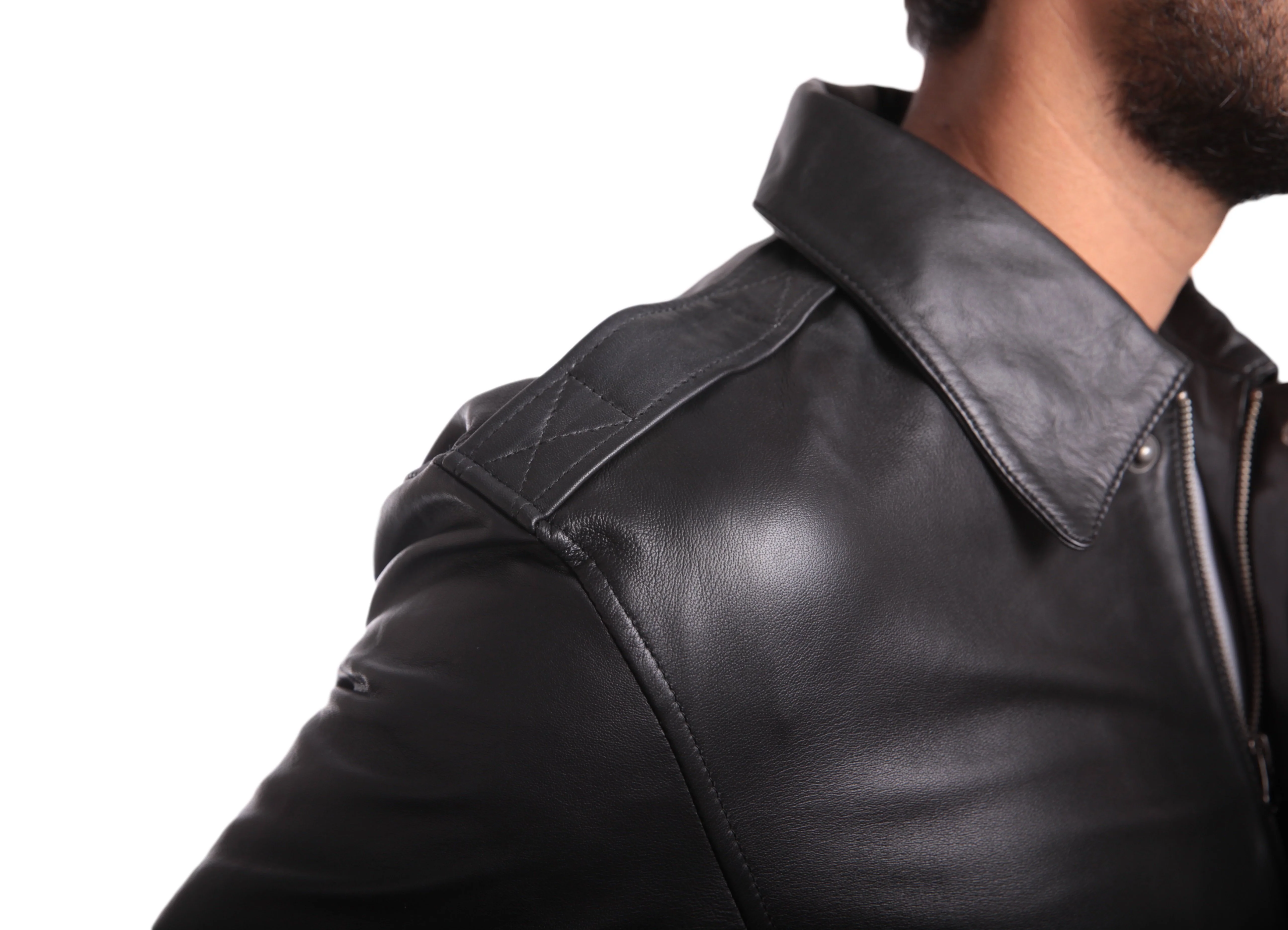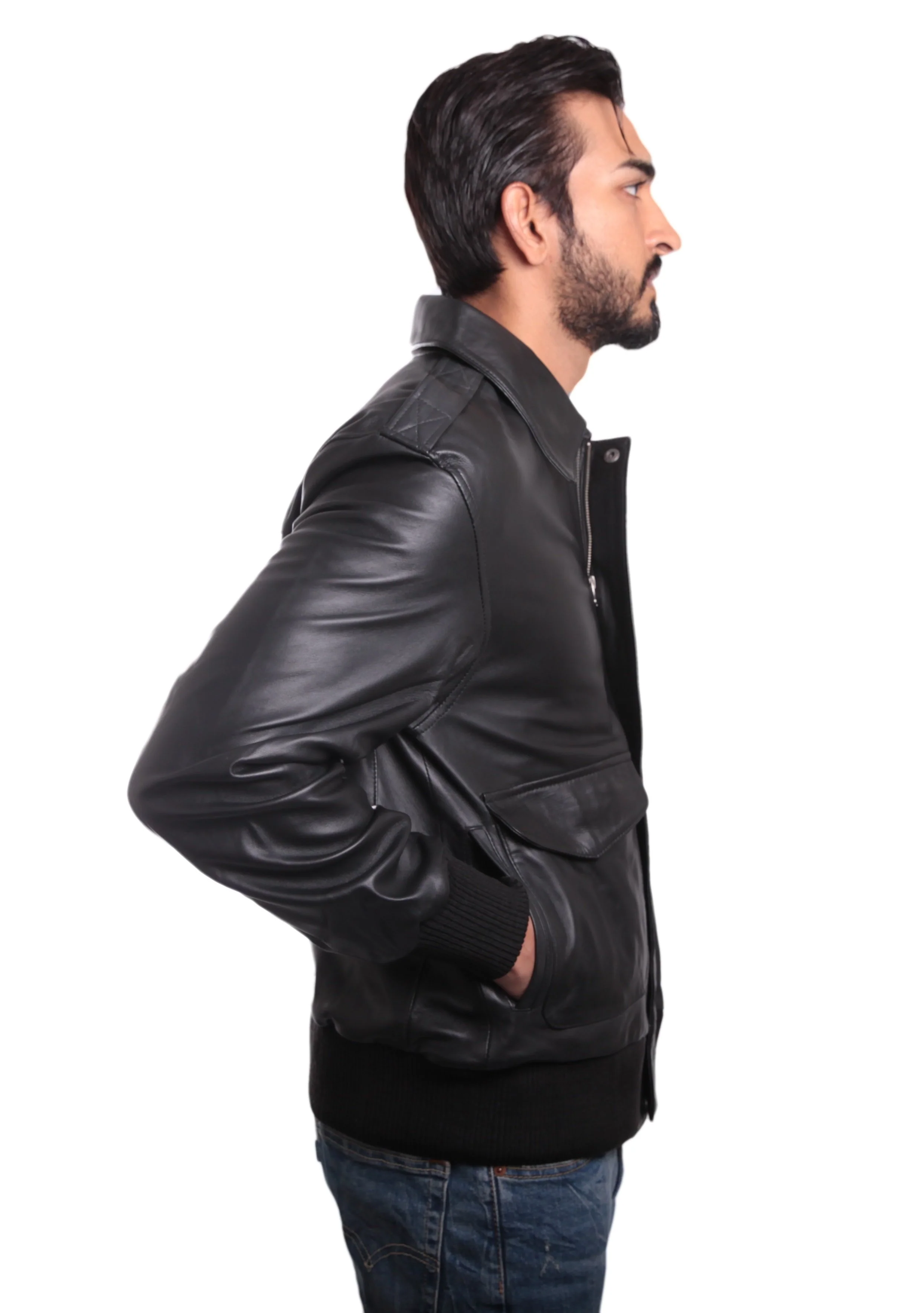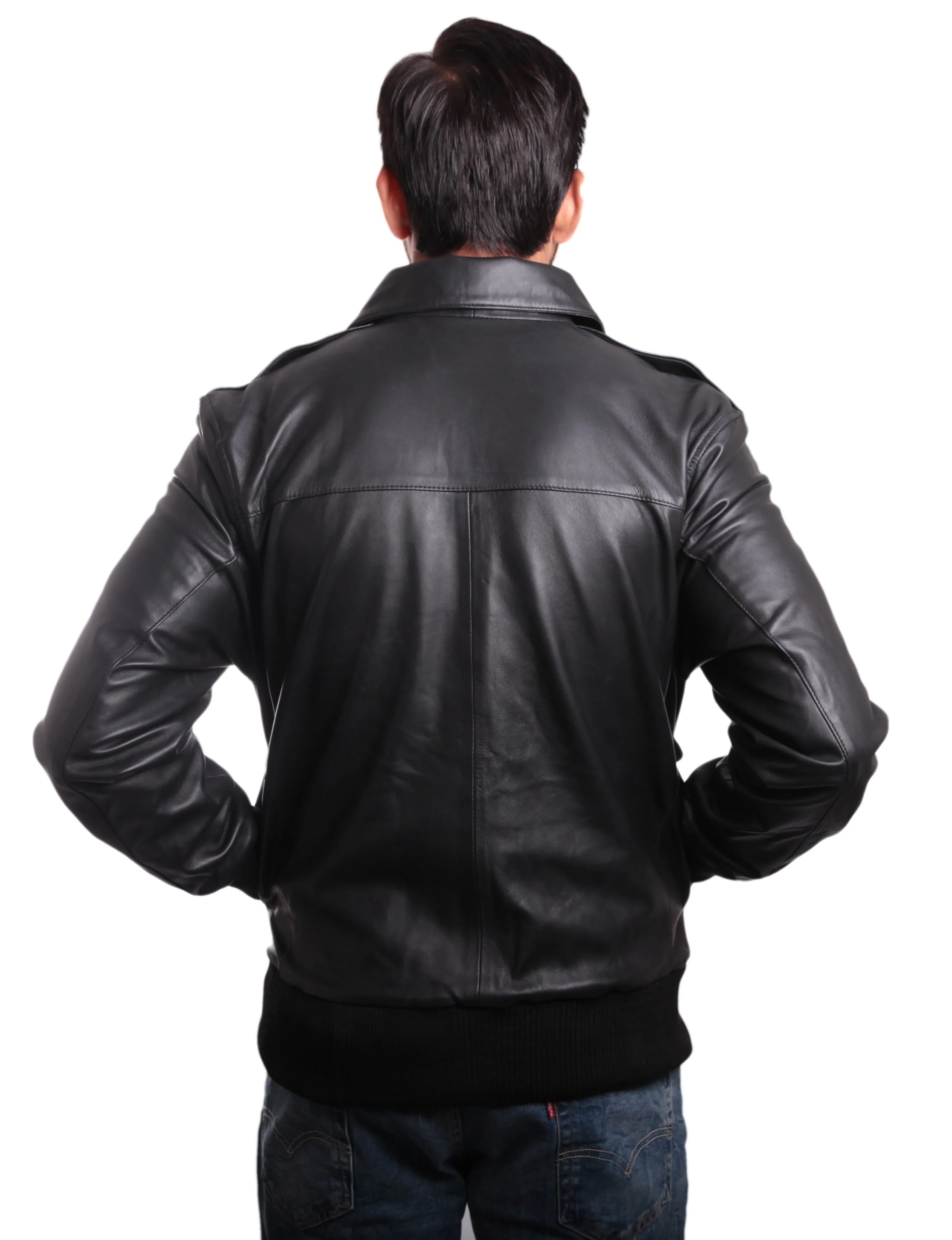 Mens Leather Bomber Jacket Made with 100% Cow Leather Polyester Lining Two front pockets Two pockets in the lining Rib on cuffs and along the waist for elasticity and great fit Zip up jacket