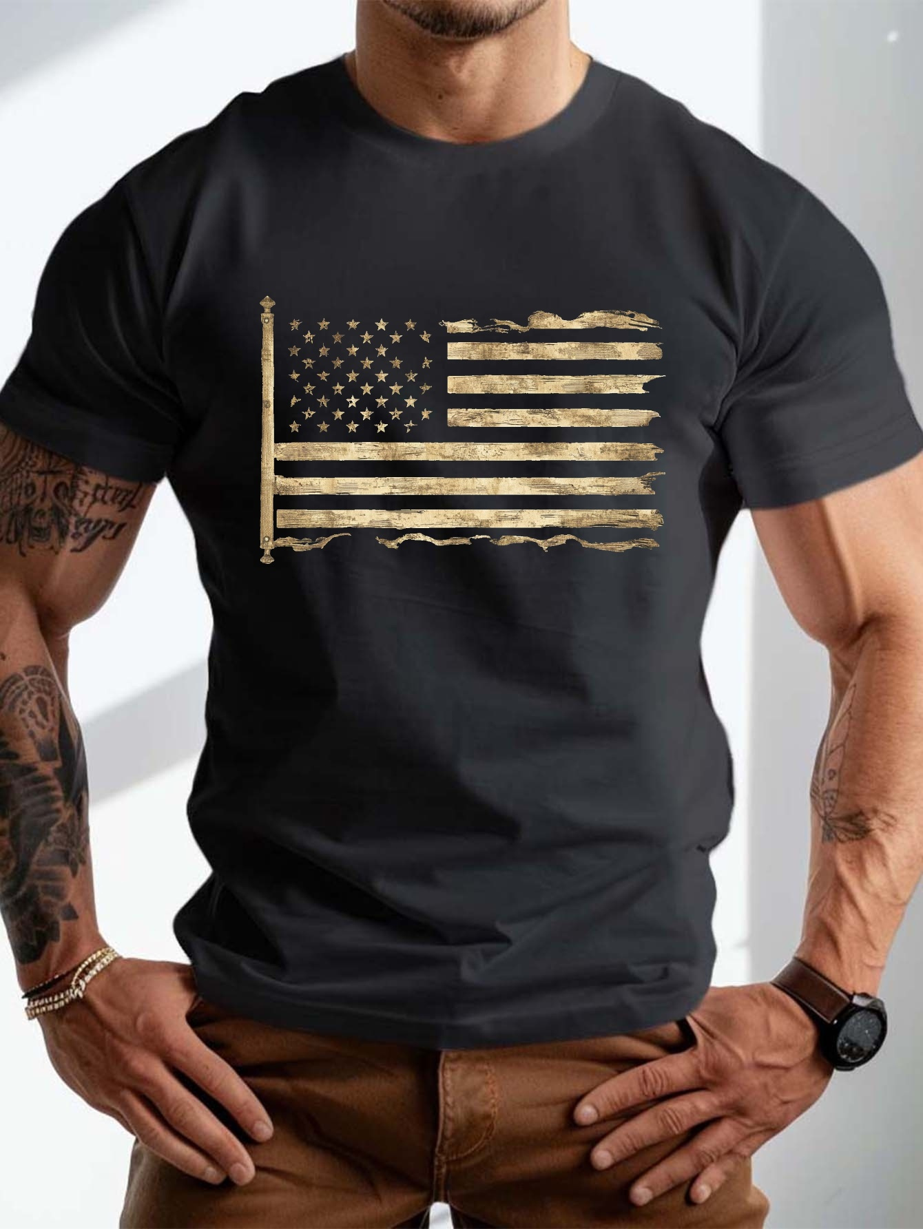 • plus size men's summer t-shirt, worn and distressed flag graphic print short sleeve tees trend casual tops for daily life, big & tall guys