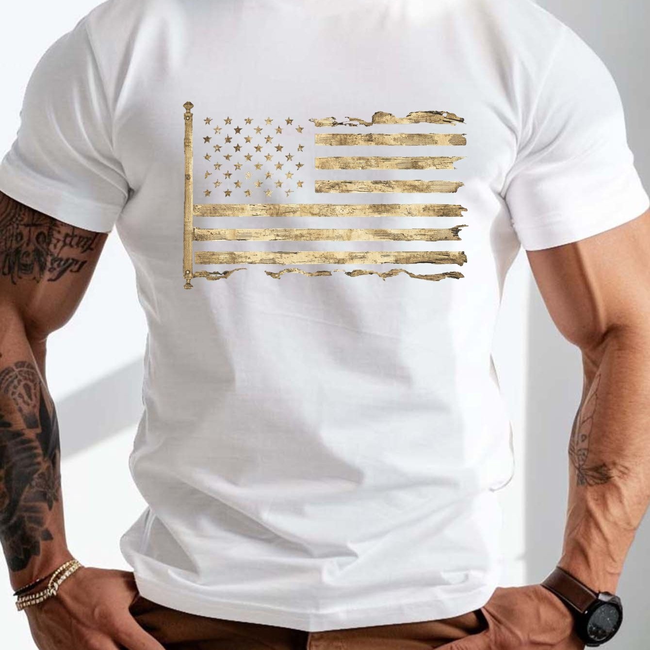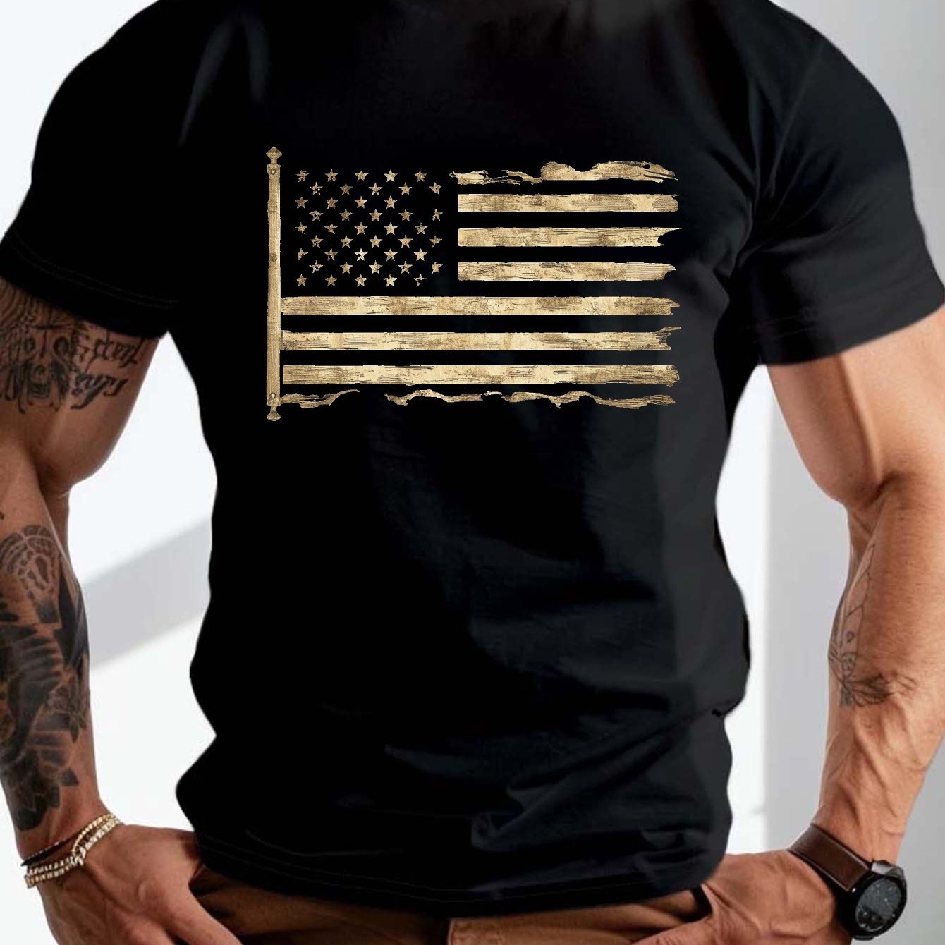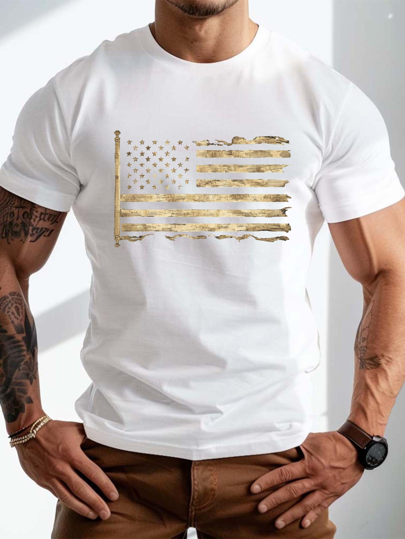 plus size men's summer t-shirt, worn and distressed flag graphic print short sleeve tees trend casual tops for daily life, big & tall guys