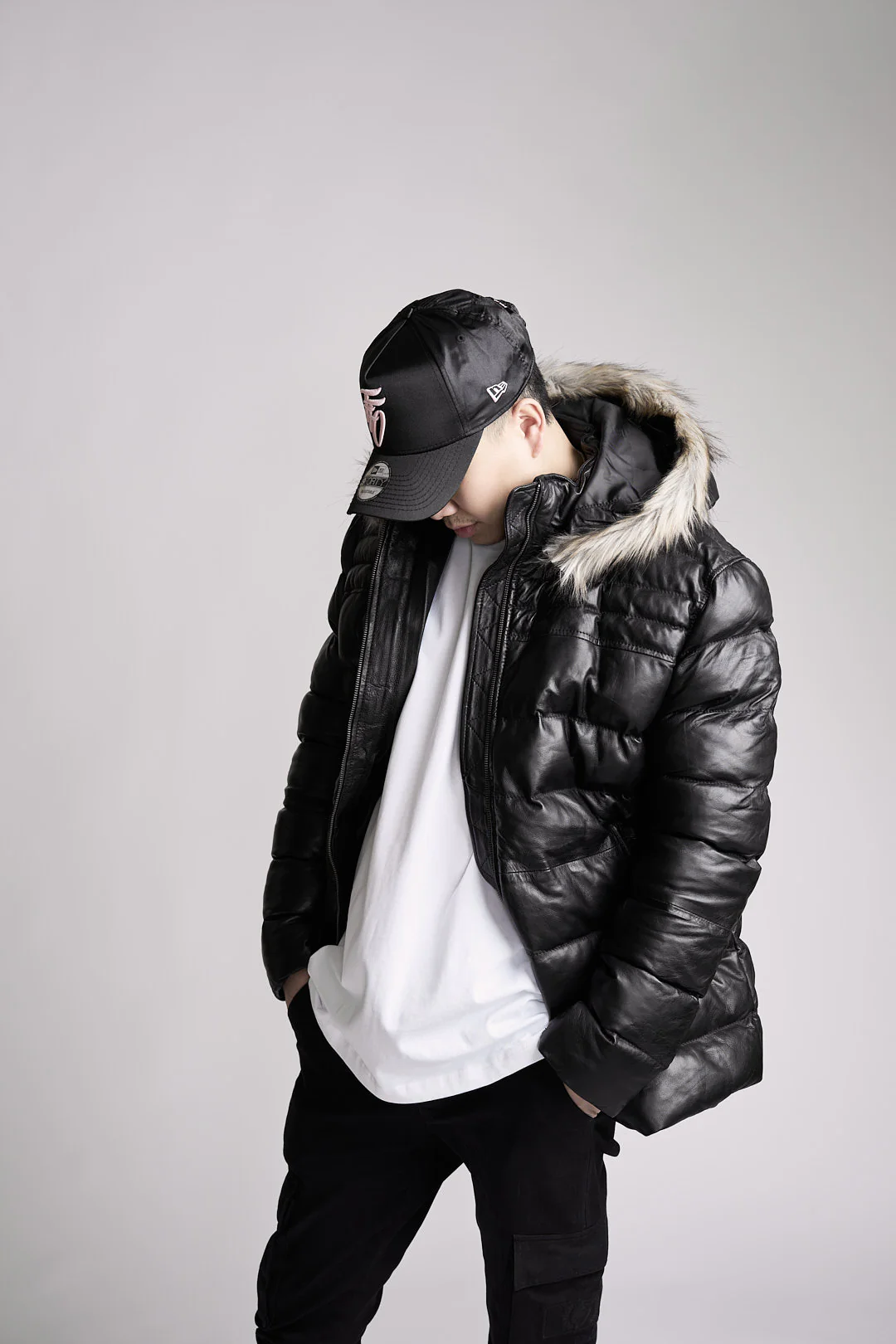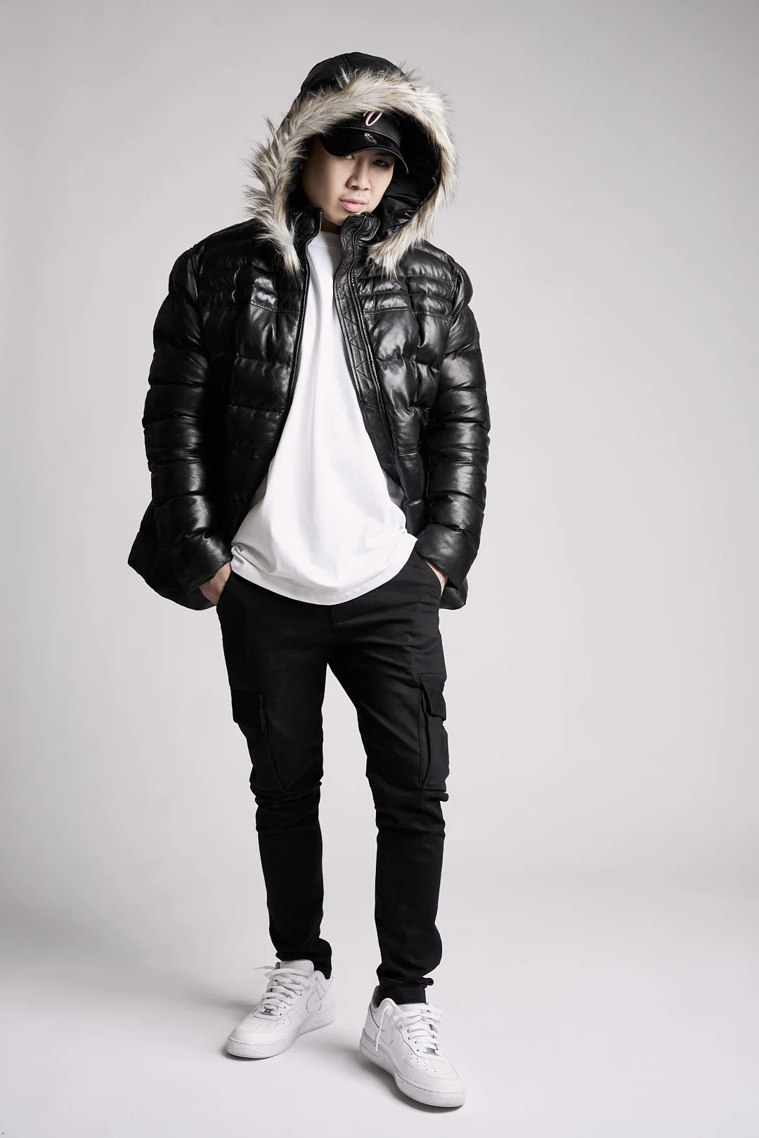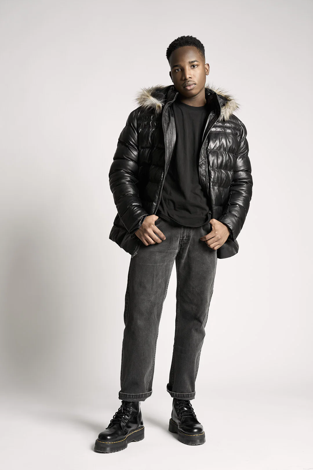 Men's Kris Black Puffer Winter Down Leather Jacket with Fur