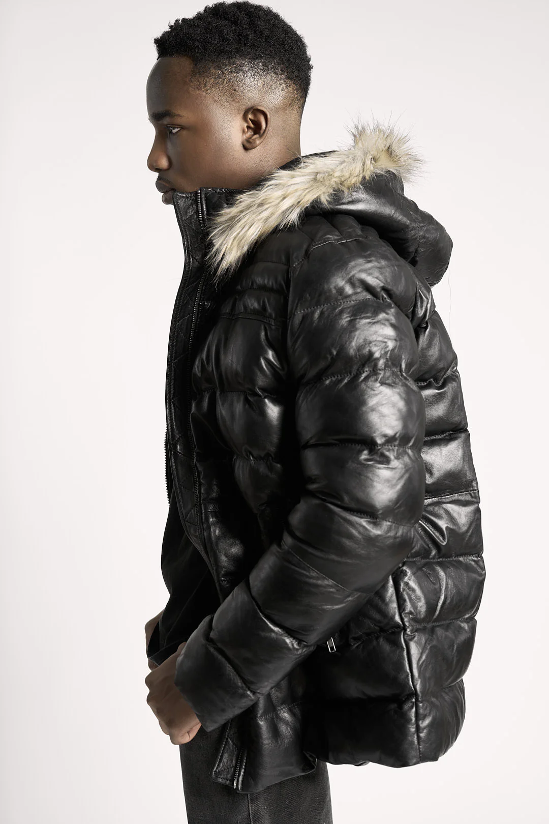 Men's Winter Black Puffer Real Leather Jacket with artificial down.  Made with Ultra Premium 100% Real Soft and Supple Lambskin Leather. Mid-Length Jacket with Fur lining on hoodie. Detachable Hoodie by Zipper. Filled with artificial down in for cold weather protection.  Great for jacket for casual and party wear.