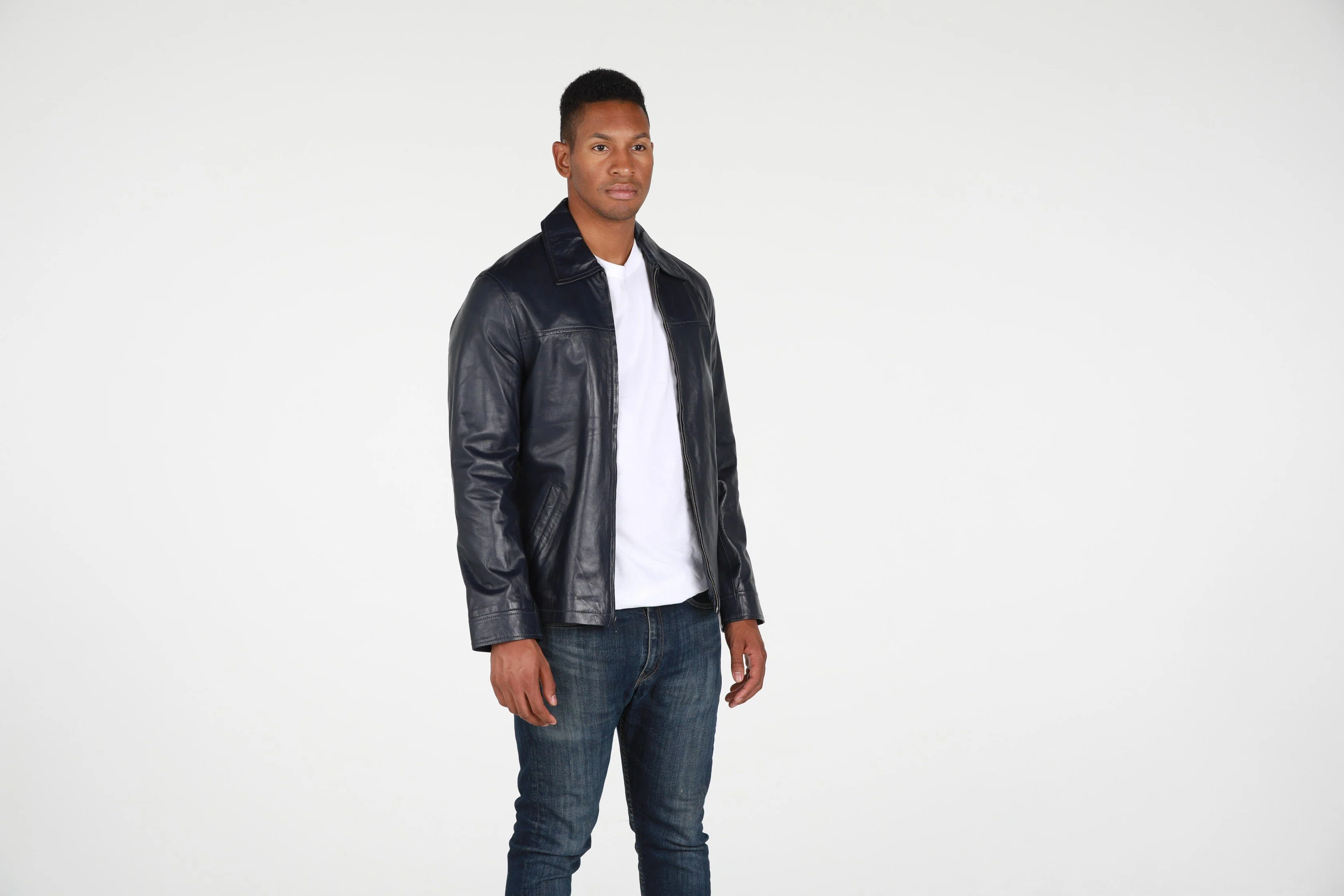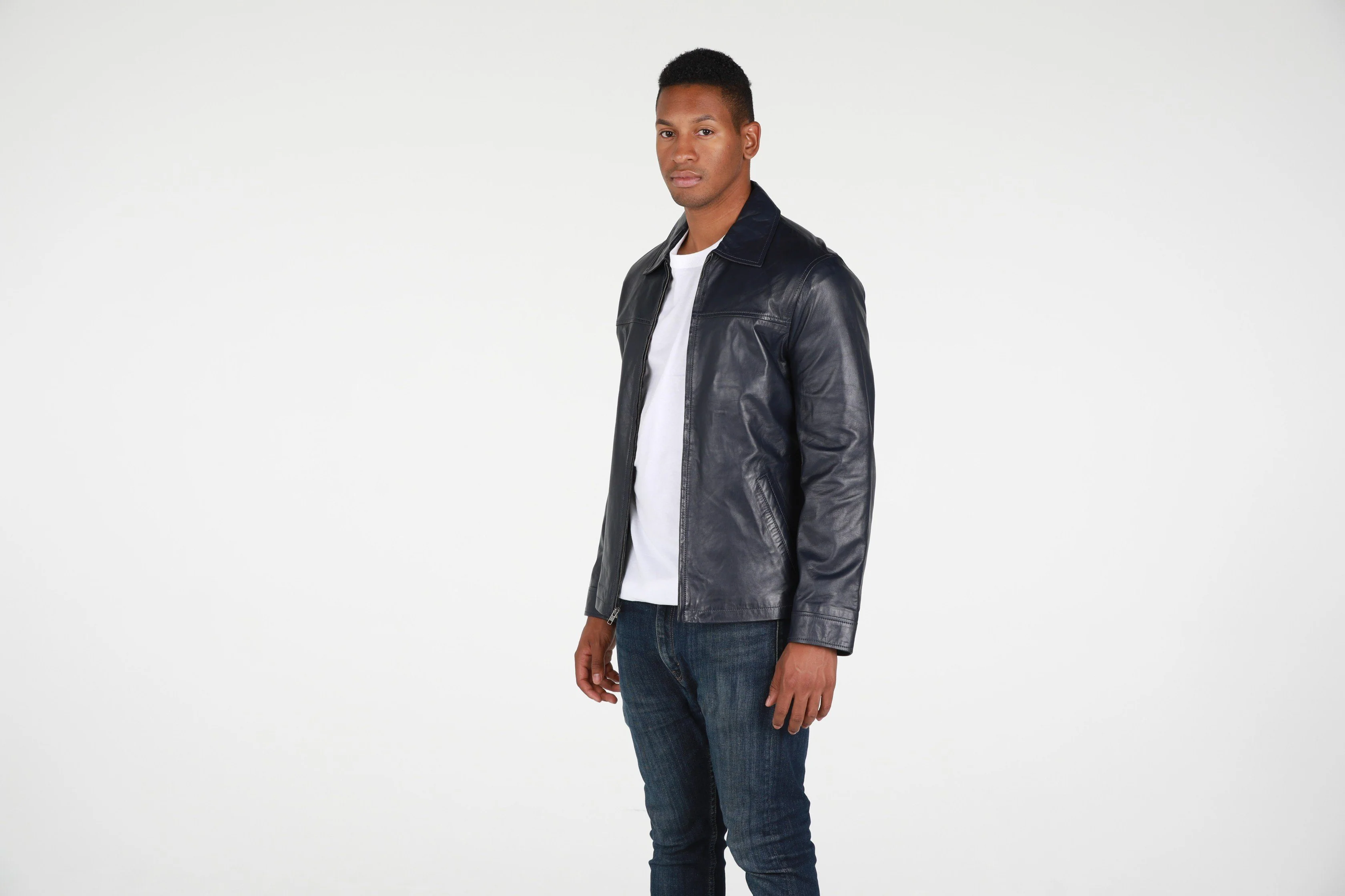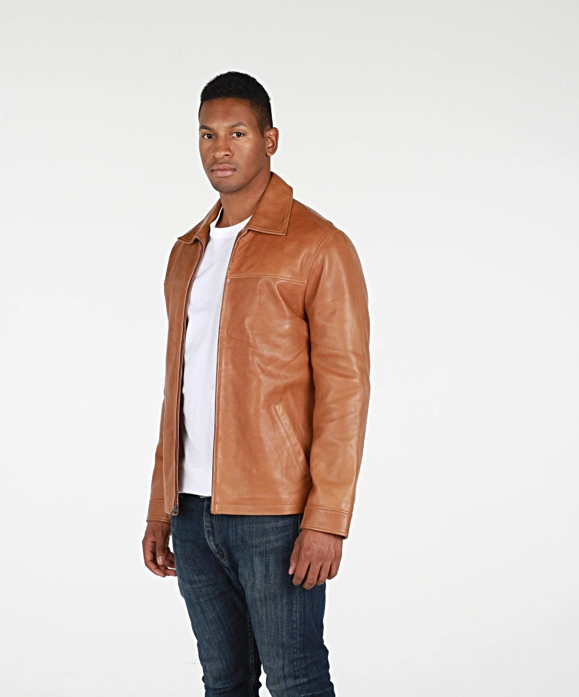 This Abbyse Mens leather jacket is made with soft and supple lambskin leather. Contemporary Mens leather jacket with straight collar, two pockets and zipper. Available in saddle tan brown color and midnight blue.