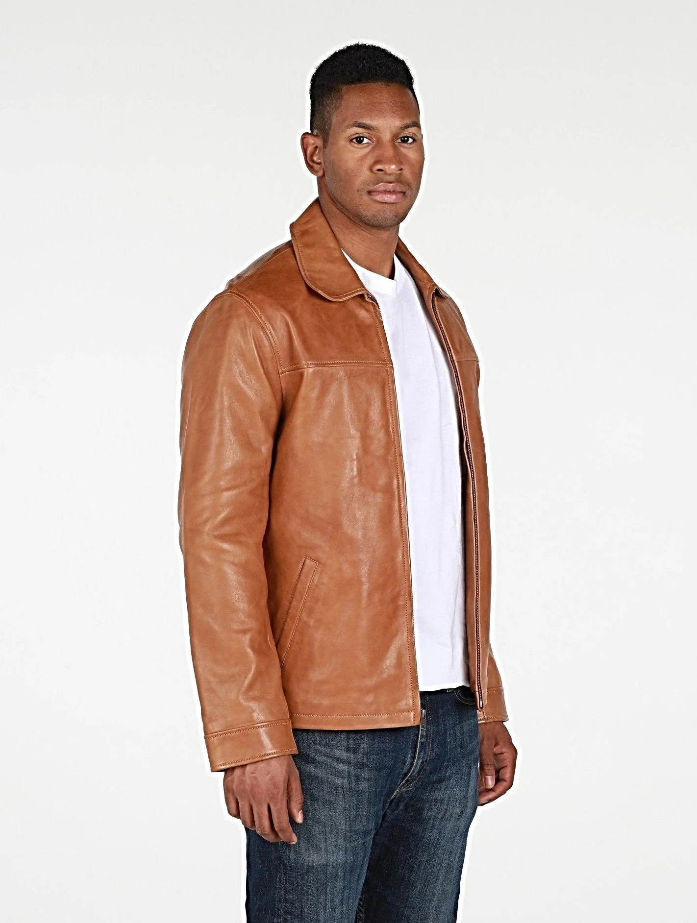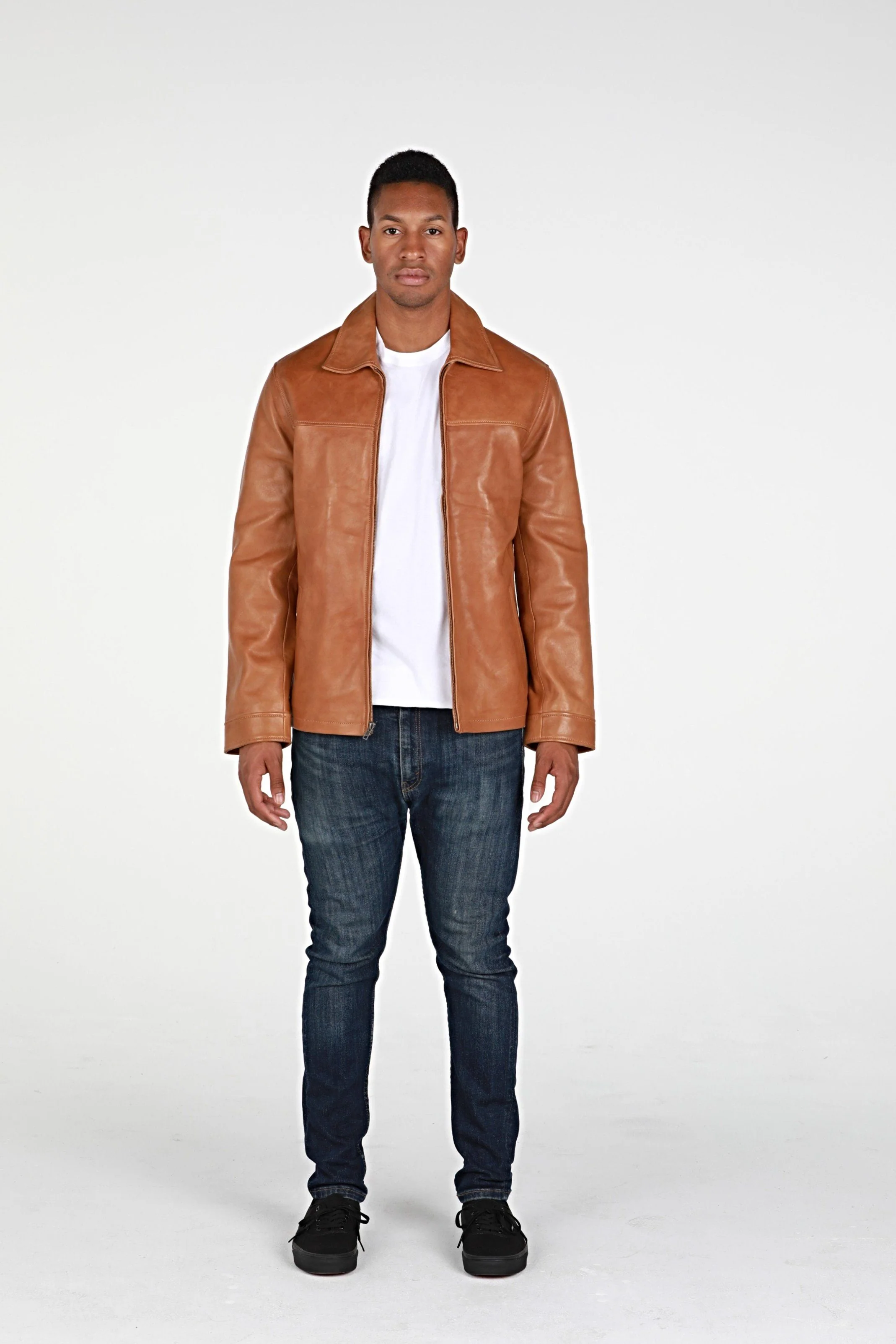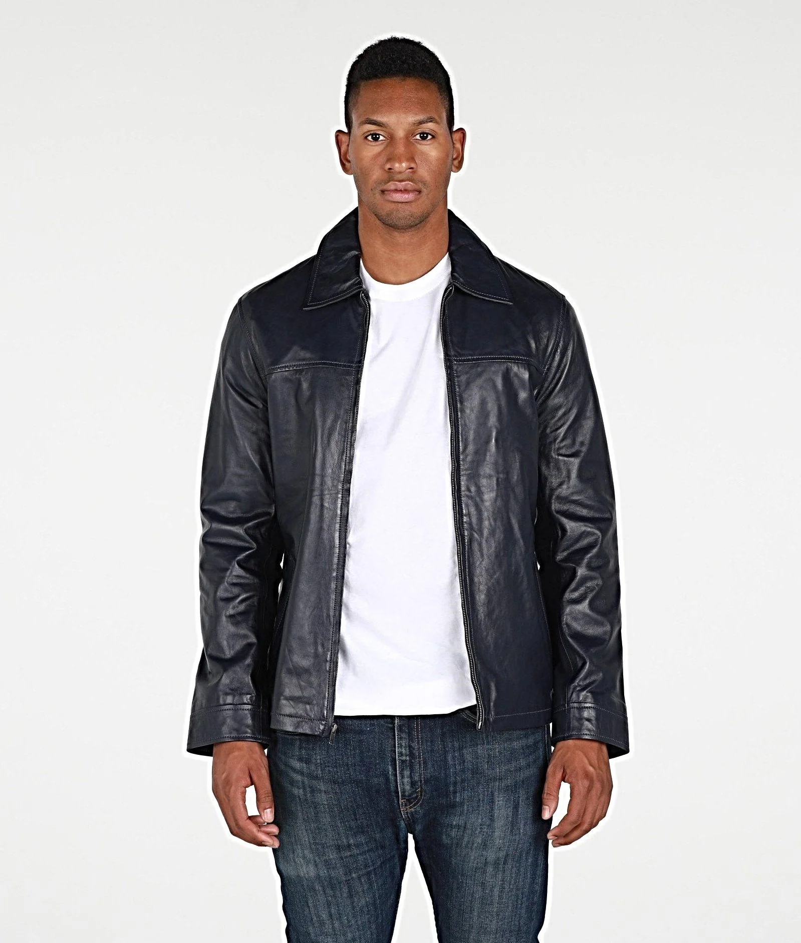 This Abbyse Mens leather jacket is made with soft and supple lambskin leather. Contemporary Mens leather jacket with straight collar, two pockets and zipper. Available in saddle tan brown color and midnight blue.