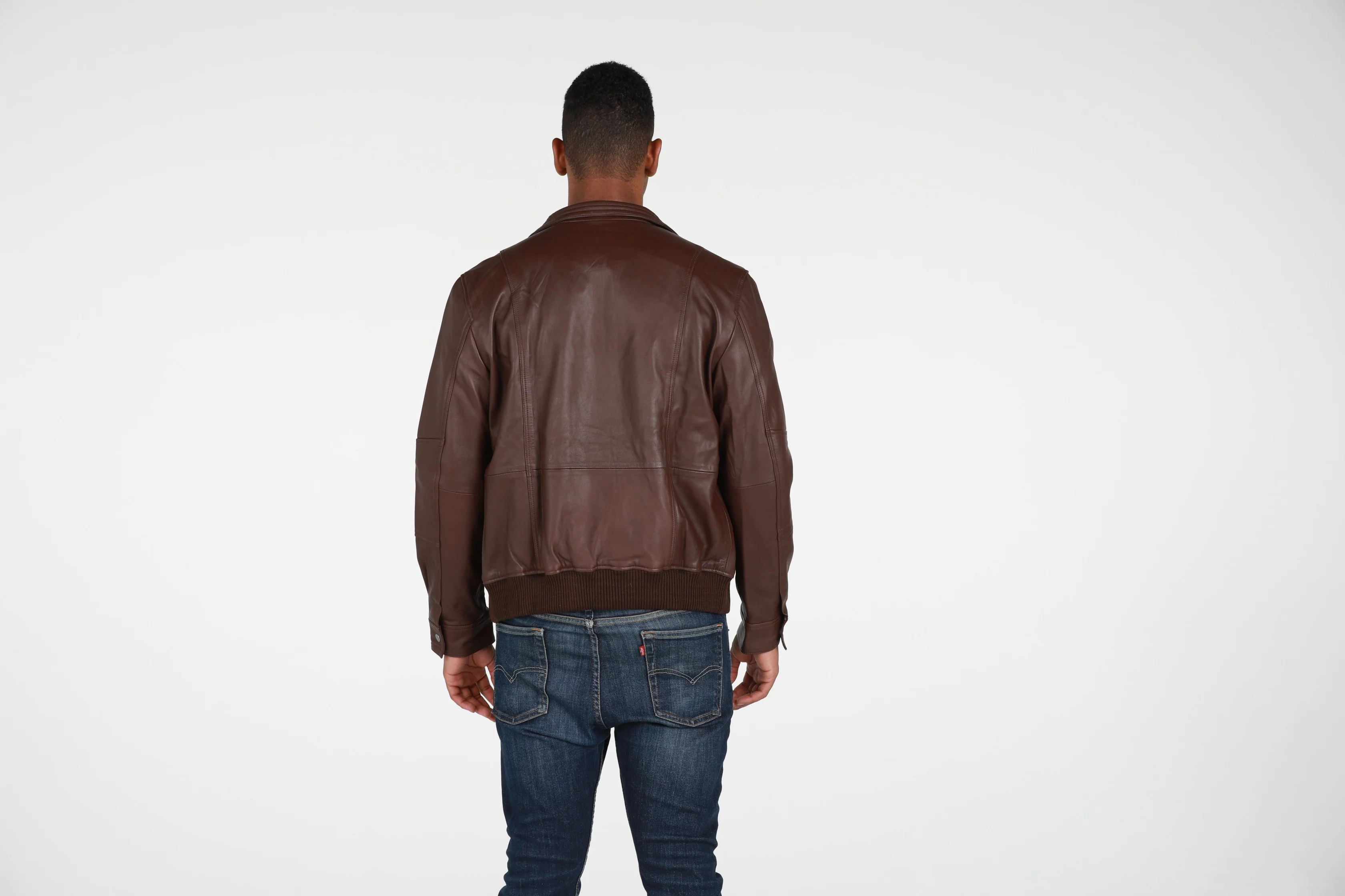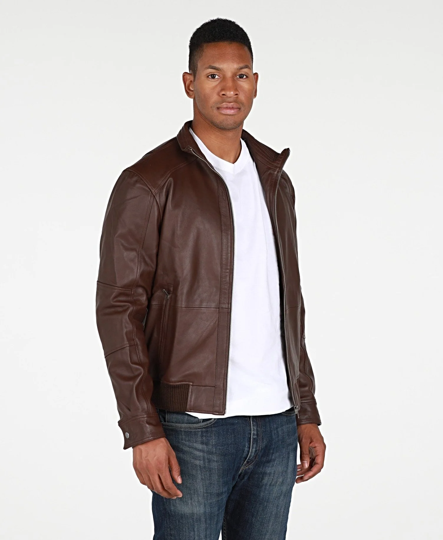 Mens leather jacket. A mens leather jacket with straight collar Rib on waistline and zippered midsection. Two deep side pockets. Soft, supple leather Made with 100% genuine leather.