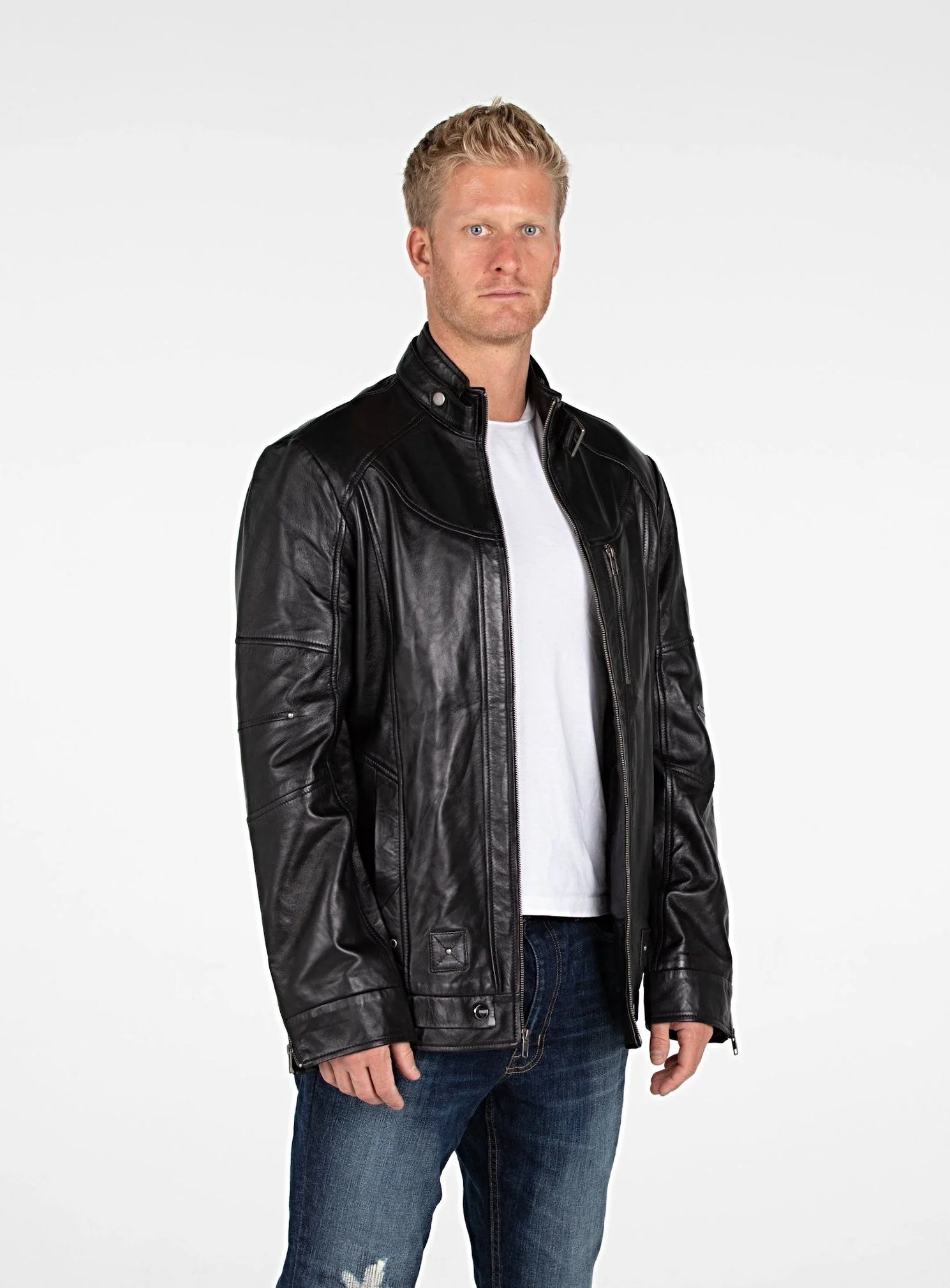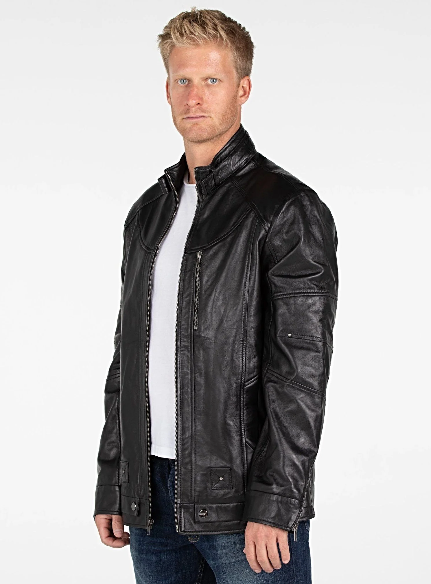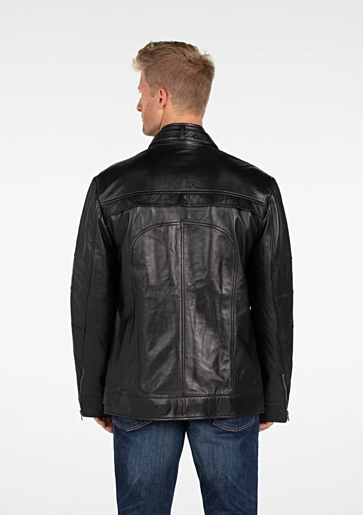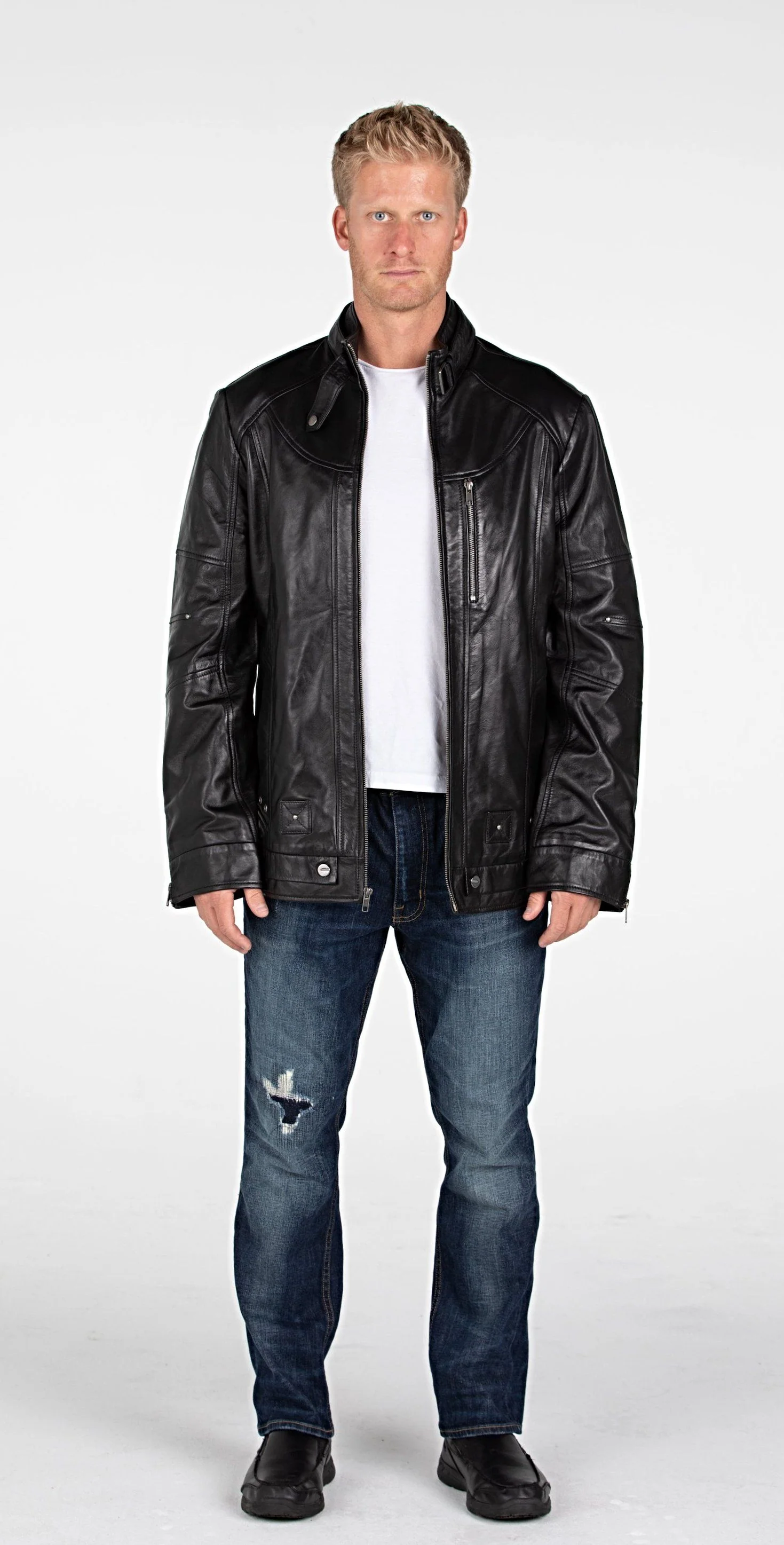 Classy Leather Jacket for Men. Made with 100% Genuine Lambskin Leather. Brass/Silver accessories used in contrast with the leather color. Leather is very soft and silky with thin gauge making it your choice of outerwear for any occasion. Polyester lining inside with two pockets. Two pockets. Lightweight and stylish. You cannot go wrong with this. A classy mens leather jacket perfect for any event. It can be dressed up or dressed down. It has a stylish outer-stitch design which gives a nice classy feel. The contrasting silver buttons give the jacket a distinguished look. This jacket is perfect for a night out with a pair of jeans.